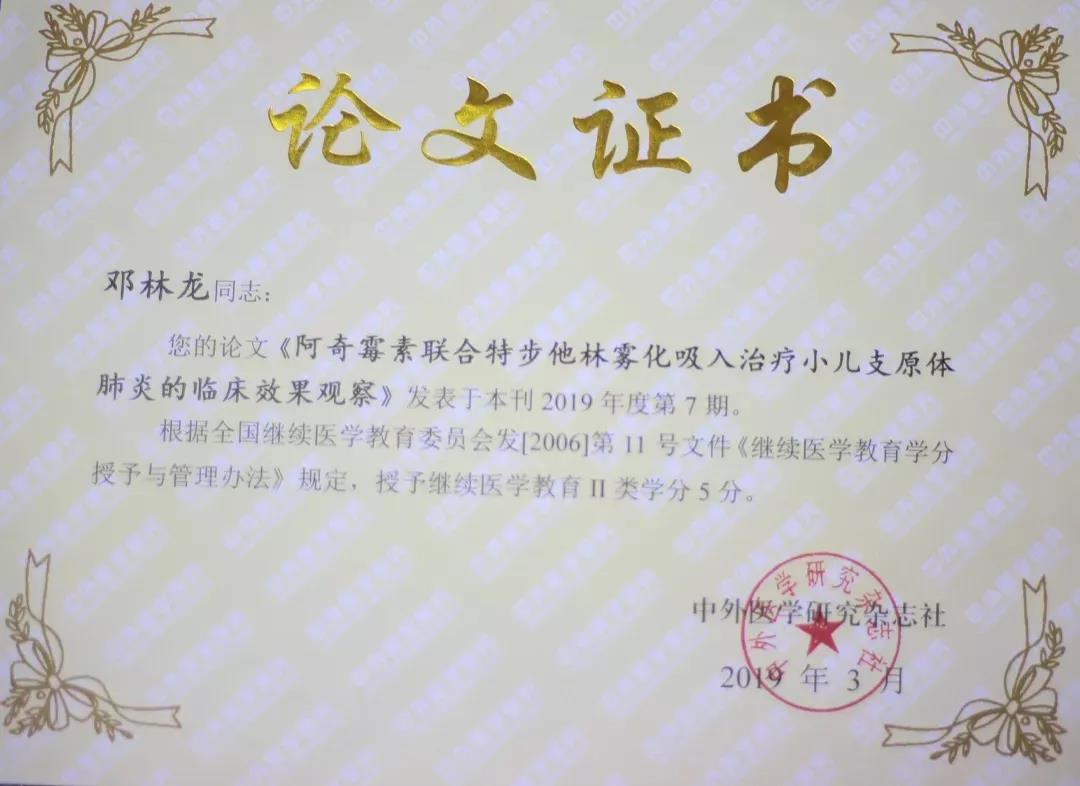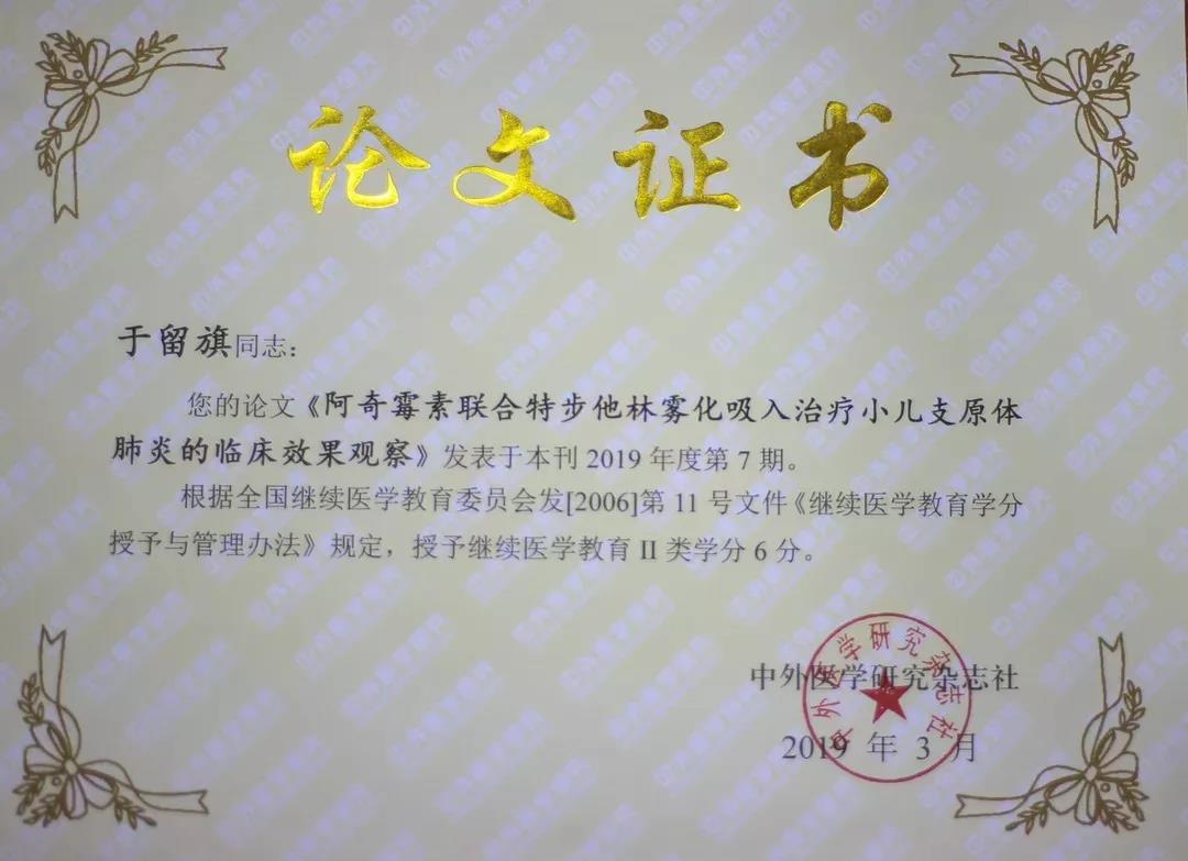 2019年1月7日我院医生于留旗、邓林龙与罗巧燕(非本院)三人合著的《阿奇霉素联合特步他林雾化吸入治疗小儿支原体肺炎的临床疗效观察》一文被刊登在第3期《心电图杂志》上。