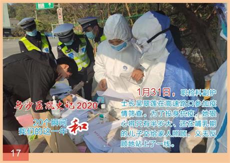 今年的“热血逆行”中,作为广大医务工作者的一份子,“乌医人”在“战疫”中也时刻谨记使命。虽然不能赴湖北前线,但在医 疗一线,在乌沙社区,在高速路口……都留下了我们忙碌的身影。除了做好院内工作,我们也主动“走出去”参加疫情防控,包括协助兄弟医院转送病人,深入社区做排查统计和防疫消 毒,赴高速路口筛查往来司乘人员等。主动请战、以院为家、加班加点,乌医人在行动,感人的故事每天都在发生。